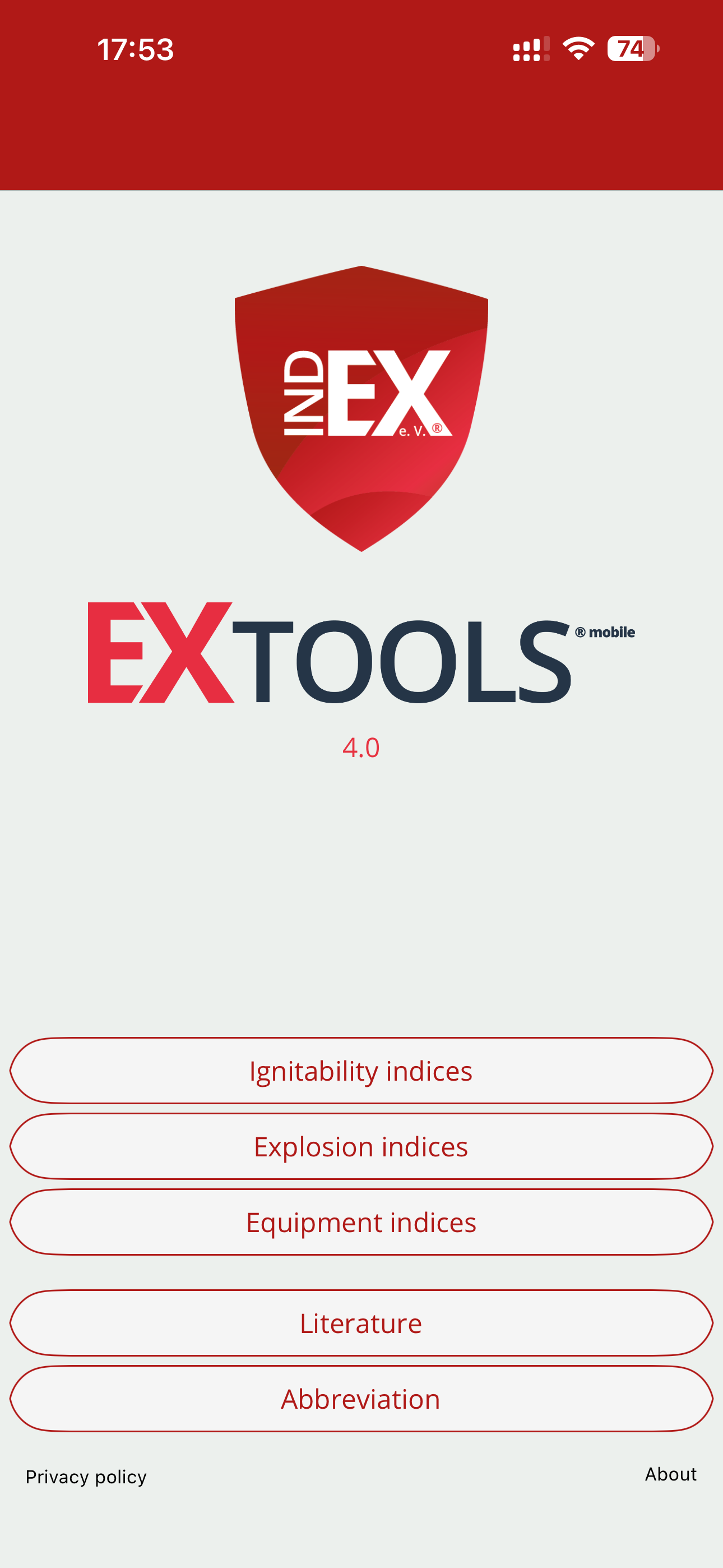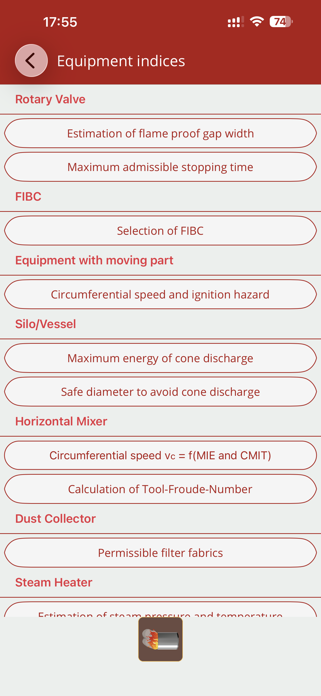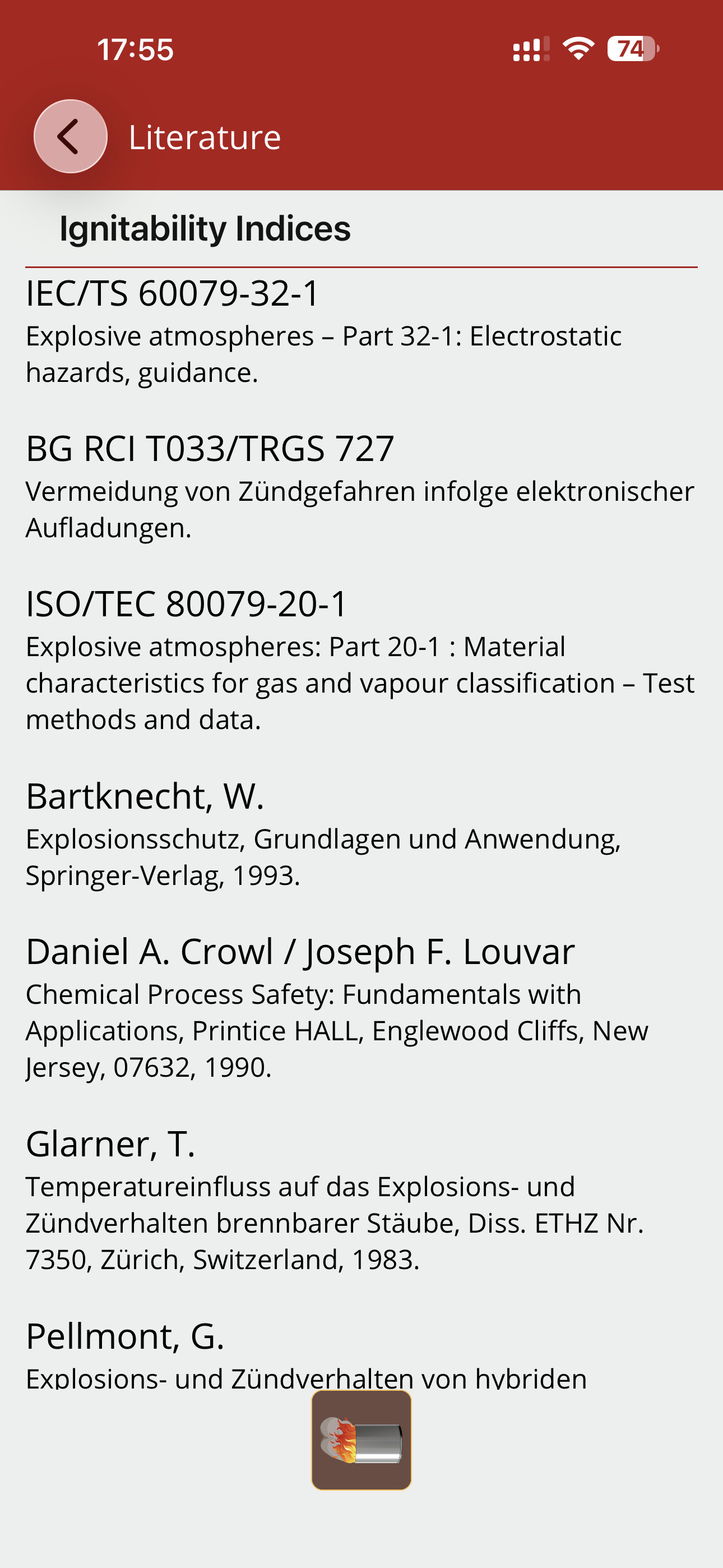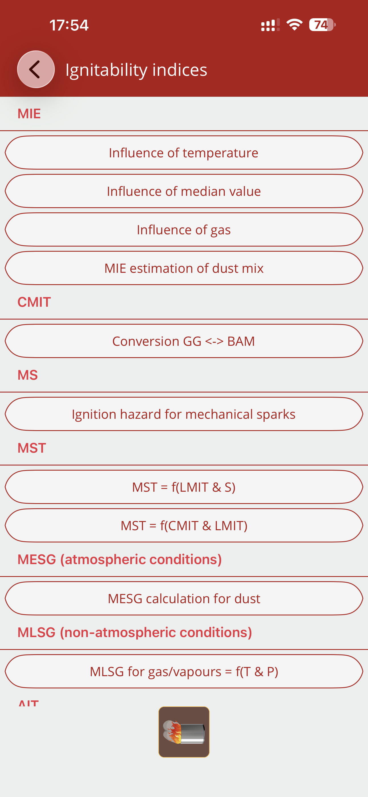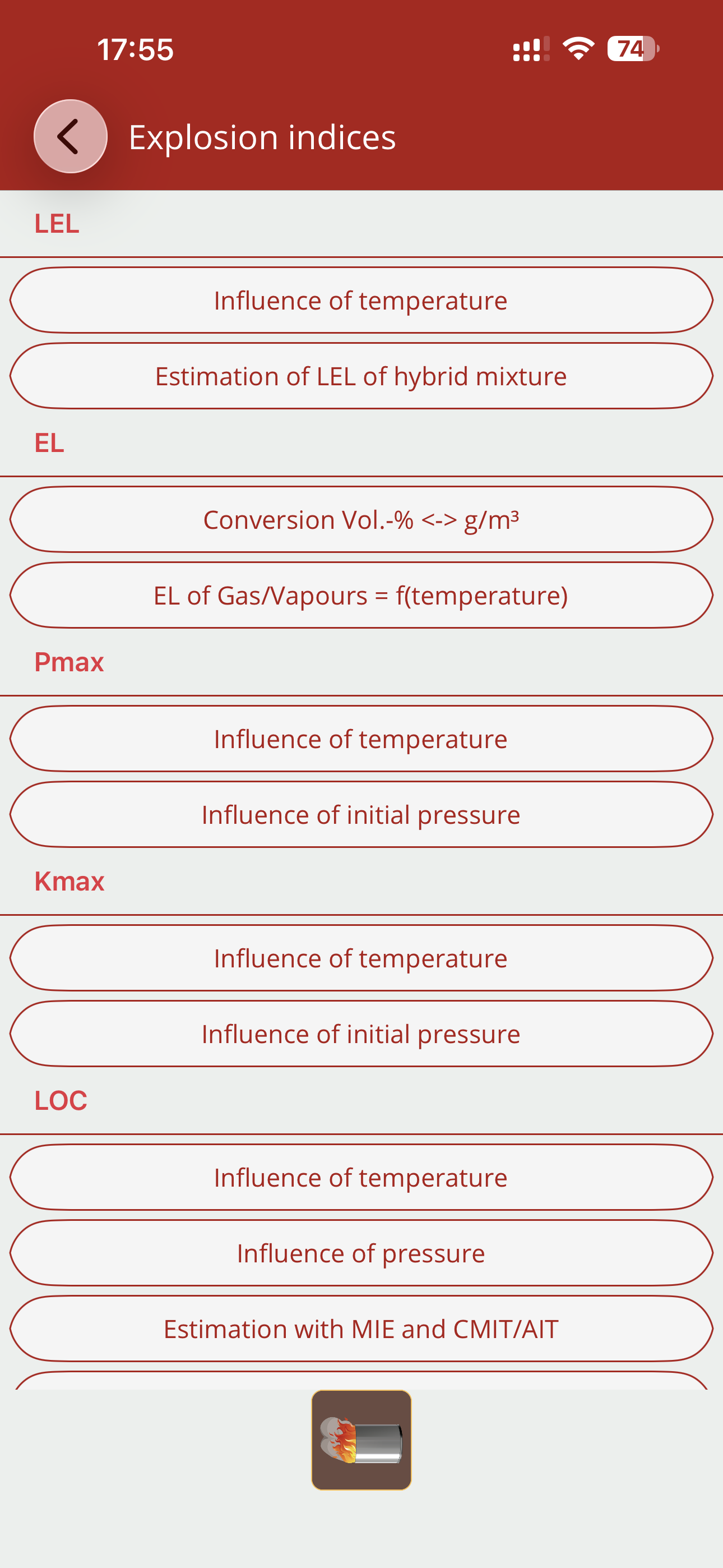 EXTOOLS®mobile is separated in five categories: «ignitability indices», «explosion indices», «equipment indices» «literature» and «abbreviations». Since the indices are obtained under standard laboratory conditions, it is important to know how they depend on factors such as temperature, pressure, particle size of the process and plant under consideration. The basic transformation rules for gases/vapours and dusts are applied.