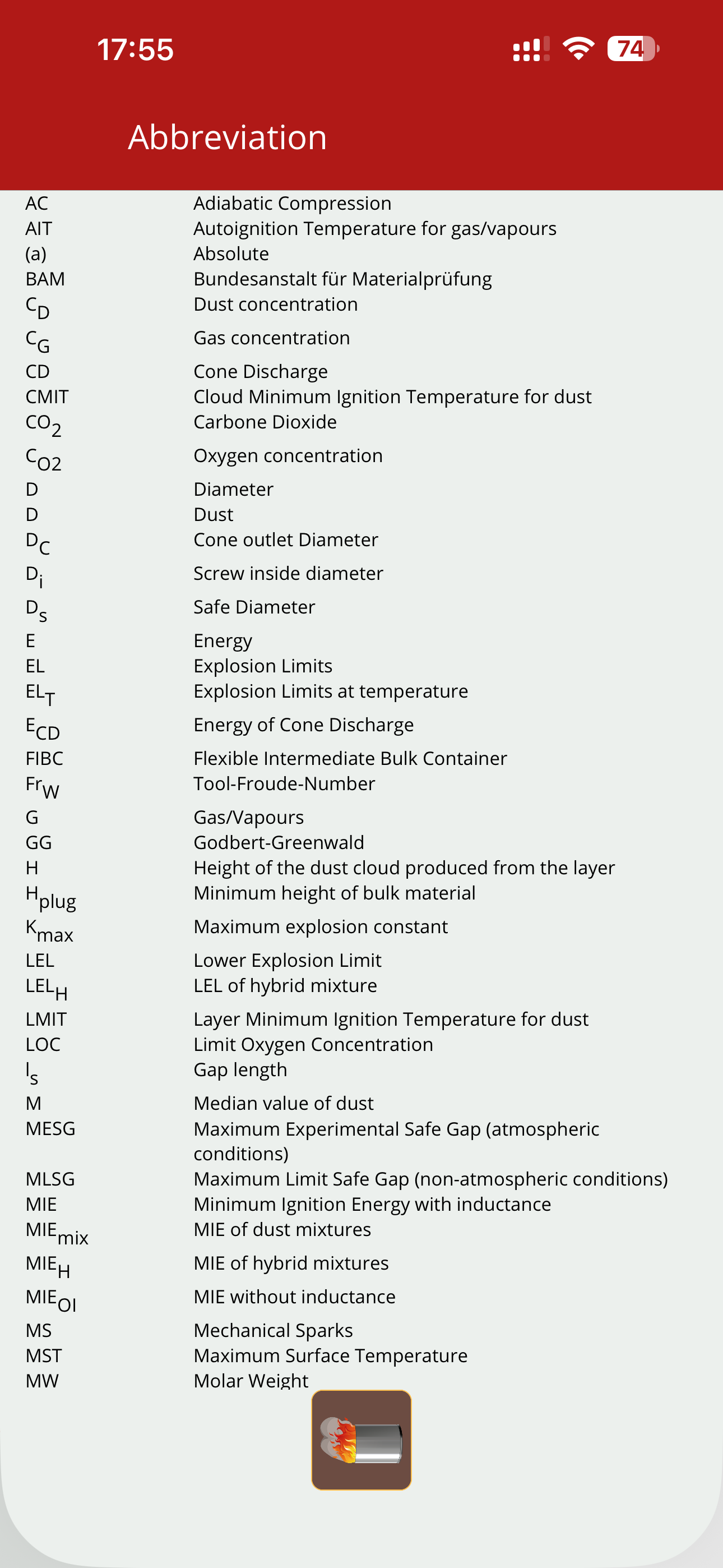 EXTOOLS®mobile also estimates the degree of ignition hazard and the energy of various ignition sources and calculates equipment-related parameters such as maximum experimental safe gap, circumferential speeds or determines the permissible type of filter fabric for dust collectors. In the "literature" you will find the information on which EXTOOLS®mobile is based. The category abbreviations explains the meaning of the used acronyms.